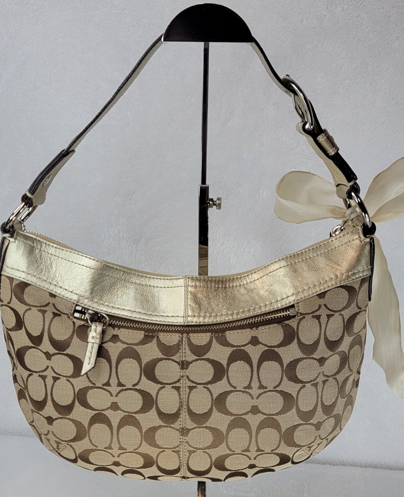 Coach 2009 Metallic Gold Trim, Pleated Signature C Canvas Hobo Shoulder Bag